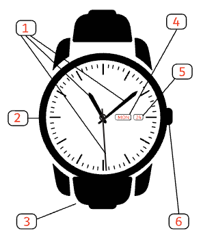 WITHOUT CHRONOGRAPH: 1. Hour, minute and second hands 2. Case 3. Bracelet or strap 4. Day 5. Date 6. Crown (date and time setting)